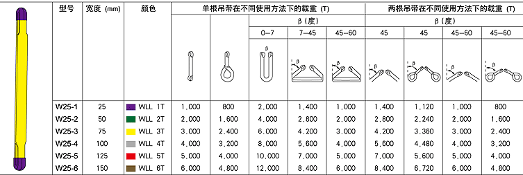 ◆可選用長度:1m,1.5m,2m,2.5m,3m,4m,5m,6m,7m,8m,10m,定購時請指明長度 吊帶使用安全注意事項 ※使用前應認真閱讀產品上的標簽以及本頁說明,嚴格按照表格內圖示使用方法的載重量進行操作,嚴禁超※載使用,確保安全 ※嚴禁使用有破損、老化和有缺陷的吊帶 ※高腐蝕性的化學溶劑或高溫狀態都會損傷吊帶,并減弱吊帶的安全性能 ※盡可能平穩和緩慢的起吊重物,防止猛然用力起吊 ※起吊帶有鋒利邊角的物體將有可能割斷吊帶,應采用耐磨損襯墊保護吊帶 ※吊帶長時間不用時應放置于干燥、陰暗的地方